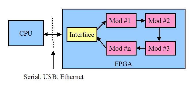 The communication protocols can change, but the message set is always the same. Currently FPGA magic is support serial ports, USB through serial ports and Ethernet. Even in high throughput designs Ethernet scales to meet most communication requirements, even at 100Mbit. The internal FPGA bus starts at 100Mbytes/second throughput, which is more than sufficient for most designs. The functional modules can be daisy-chained in any order, and the same module can be used repeatedly.