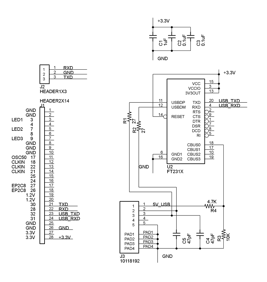 The EP2C5T144 FPGA board is the main board used for most designs. It supports approximately 5K logic units with 13Kbytes of internal memory. The circuit board has four ports for expansion, with port 4 primarily used for interfaces.