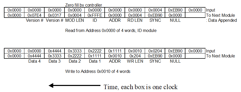 This bus is based on the idea that the data flows through the modules’ registers in time and is acted upon as required by the message. This method is optimal for an FPGA since no memory and minimal resources are required in each module. The bus is 16 bits wide with a data delay of one clock per module. The default bus speed for the EP2C5 (a very old part) is 50MHz, which provides a bus bandwidth of 100MBytes/second. The bus supports read and write across multiple modules. Each message starts with a null character 0x0000, followed by a sync character 0xEB90. The write message contains the data being written, and a read message has the data appended to the message. The address space for the bus is 16-bit, with 16-bit words (128 Kilobytes). Each block is a minimum of three words long, as shown in the list below.